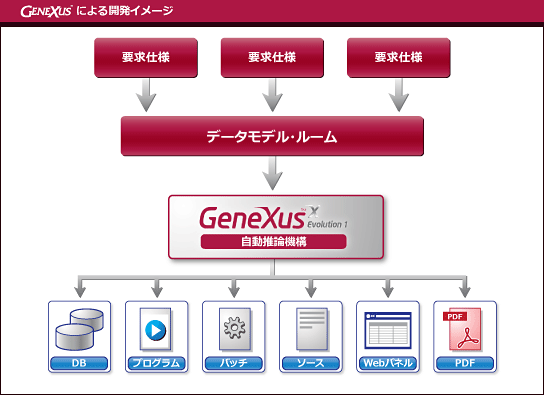 開発時は、要求仕様からデータモデルを設計し、アプリケーションの振舞いをルールとして記述すると、AIとも呼べるGeneXus の自動推論機構が、ソースコード、データベースを作成し、さらに、WEB画面、電子帳票(PDF)、サーバ/バッチプログラムを自動生成しますので、基本的にプログラムレスで開発を行えます。